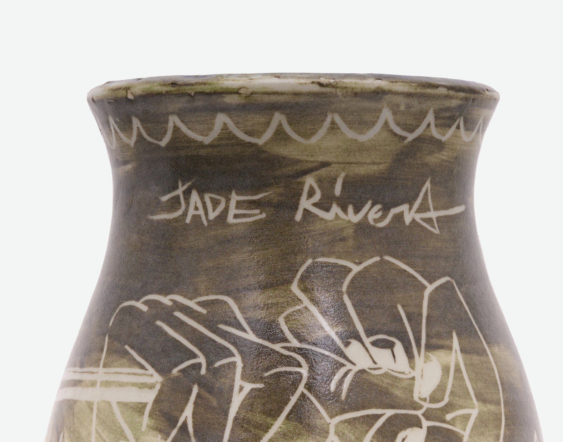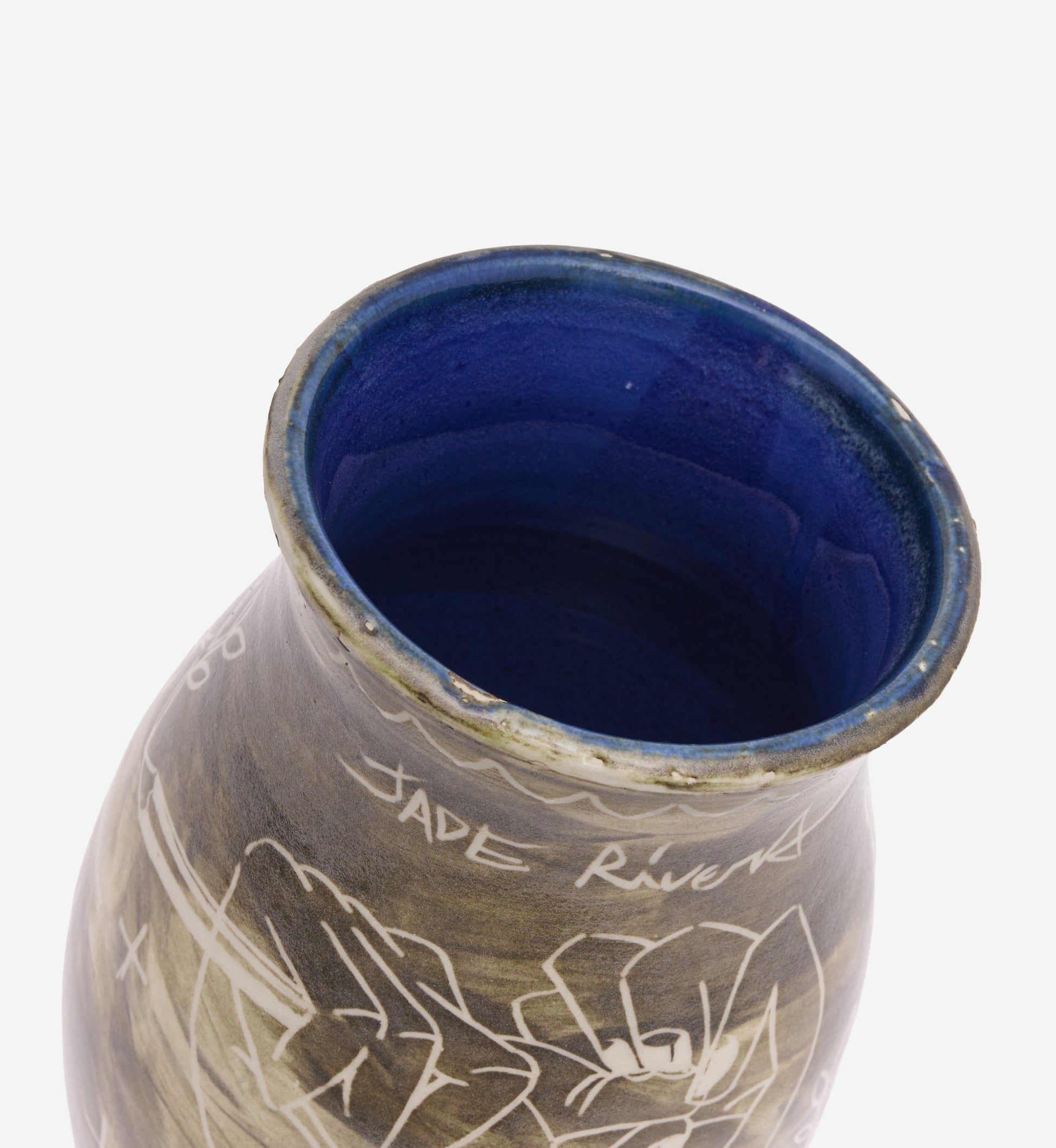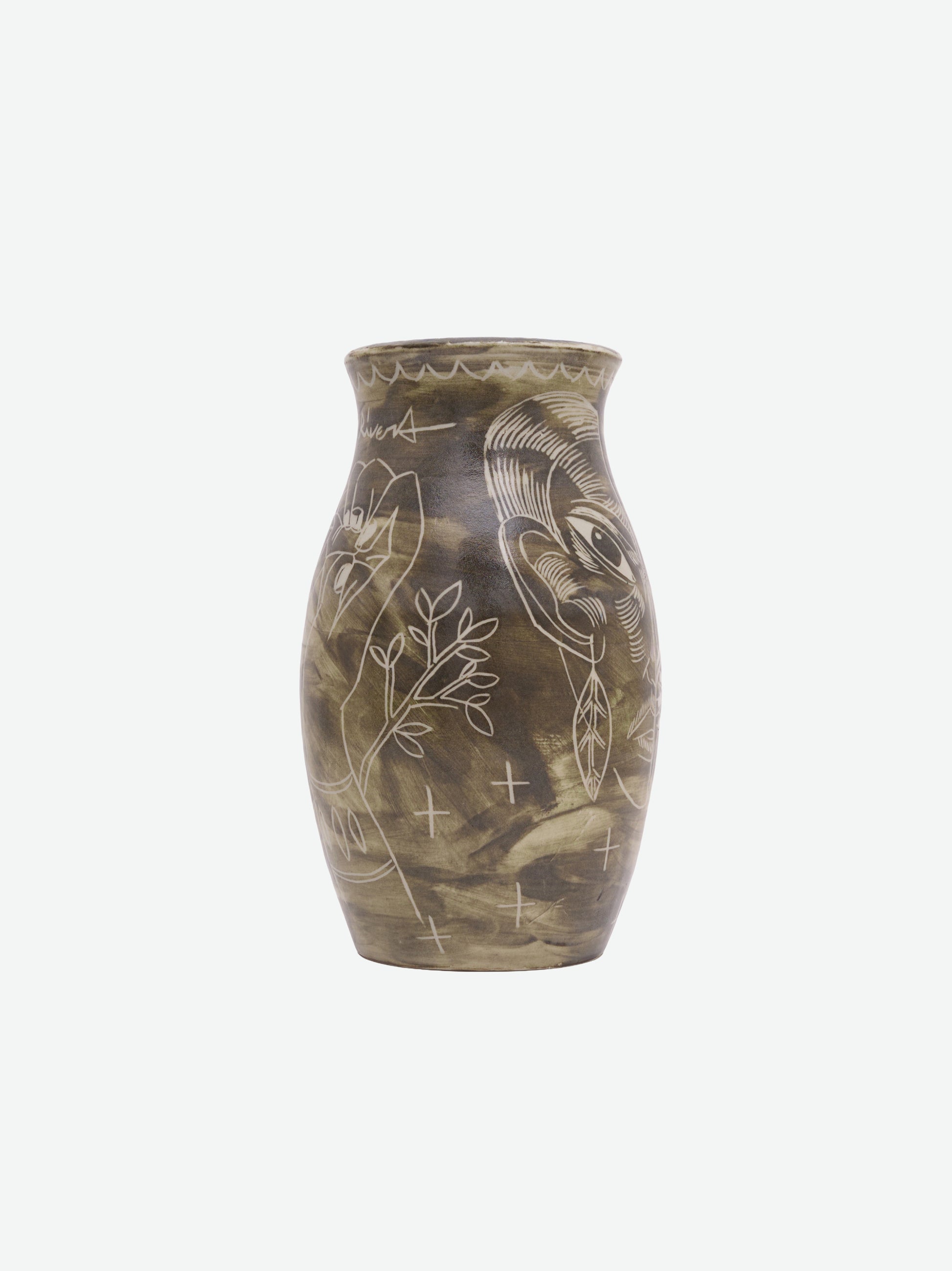 Wheel-thrown and hand-etched piece, featuring iron oxide application during the first firing. The second firing reveals a transparent glaze on the exterior and Glaze 37 on the interior. The surface contrasts a soft satin finish on the outside with a luminous gloss within, unveiling a warm reddish-brown base tone that reflects the depth of its material and the quiet poetry of the artisanal process.