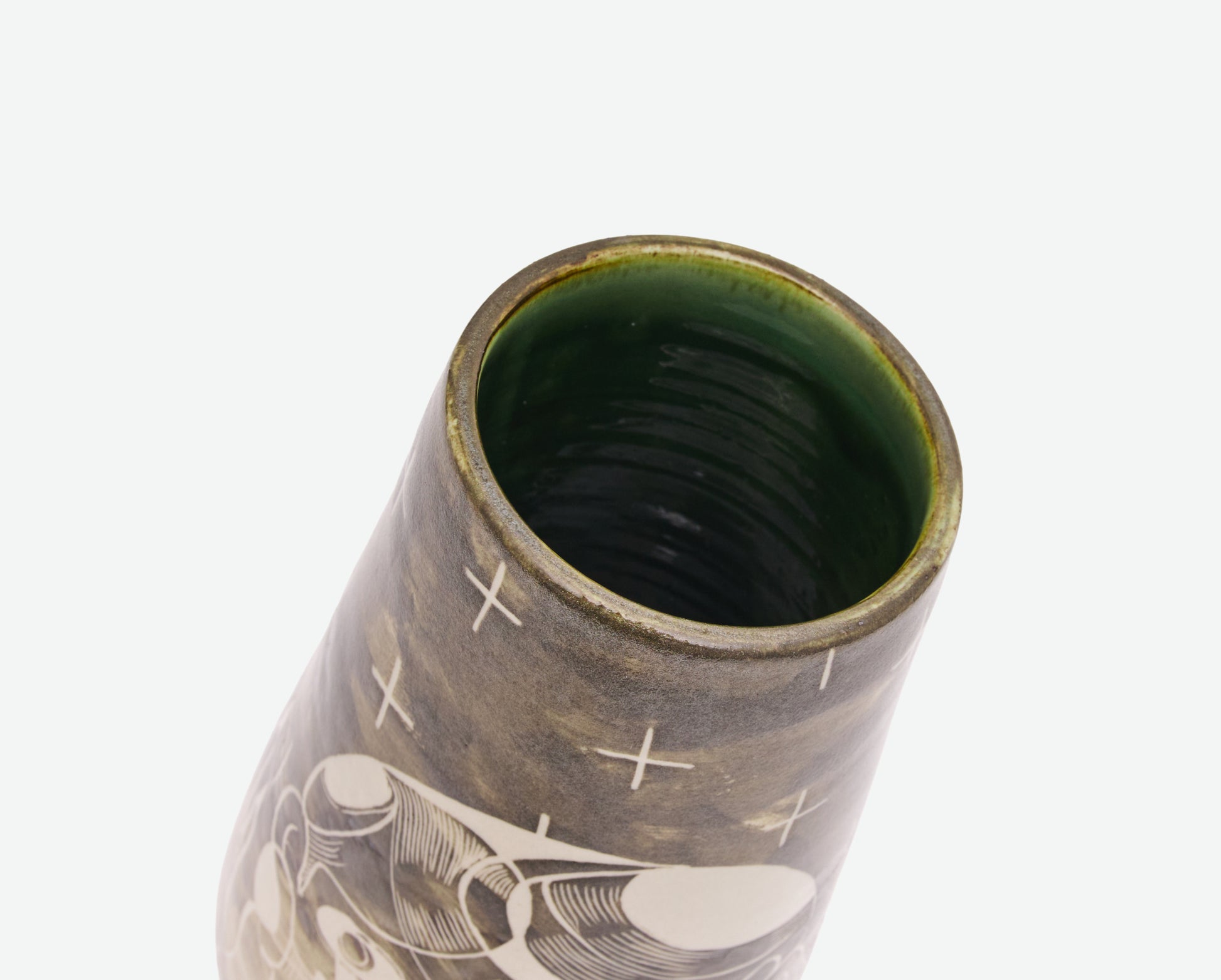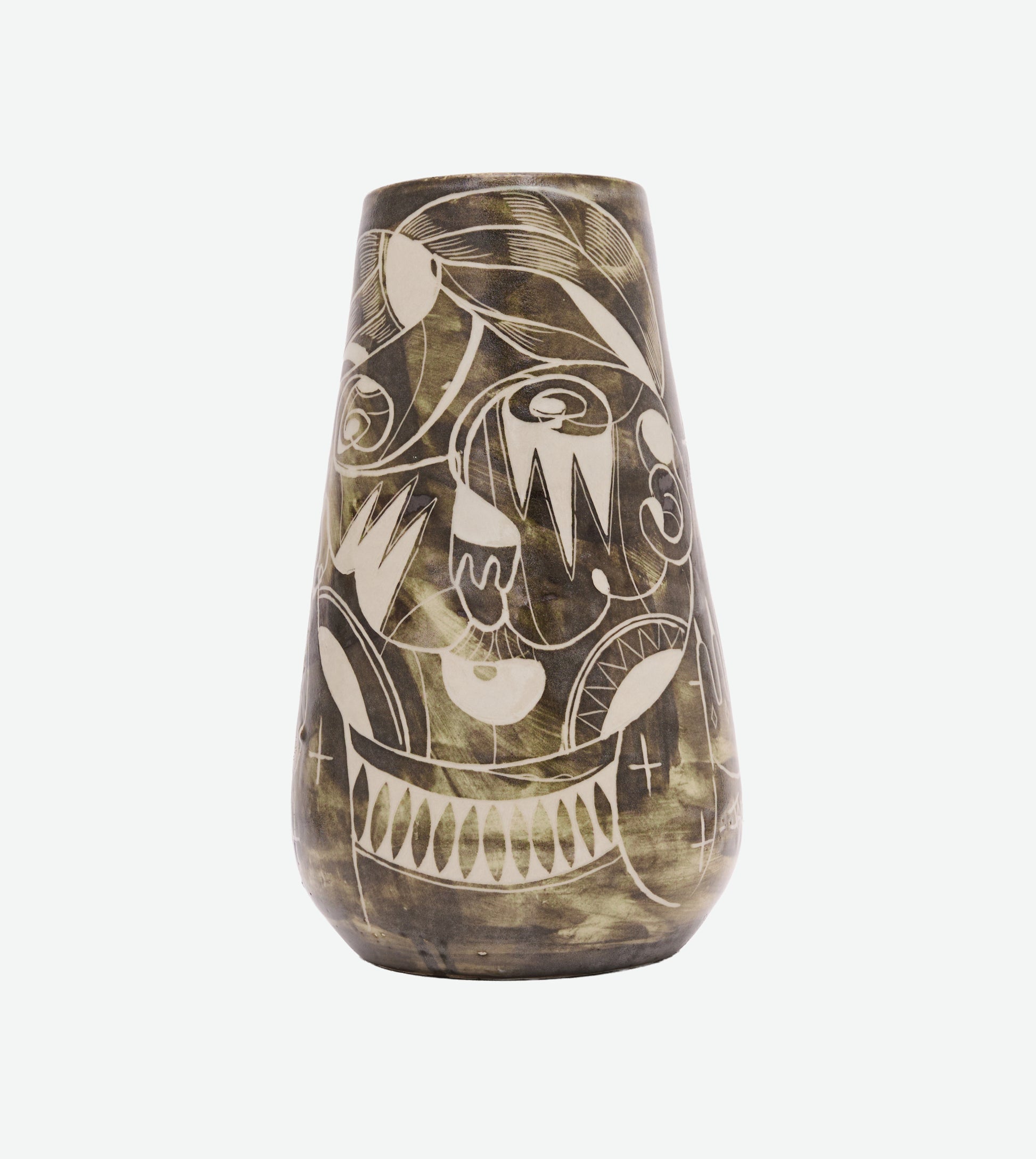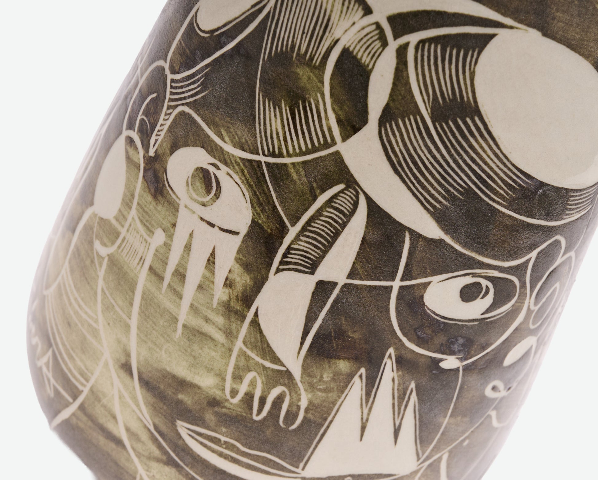 Wheel-thrown and sgraffito-carved ceramic, with iron oxide applied in the first firing and glaze no. 23 inside during the second. The exterior reveals a matte, reddish-brown surface, while the interior shines with a glossy finish — a quiet contrast between earth and light.