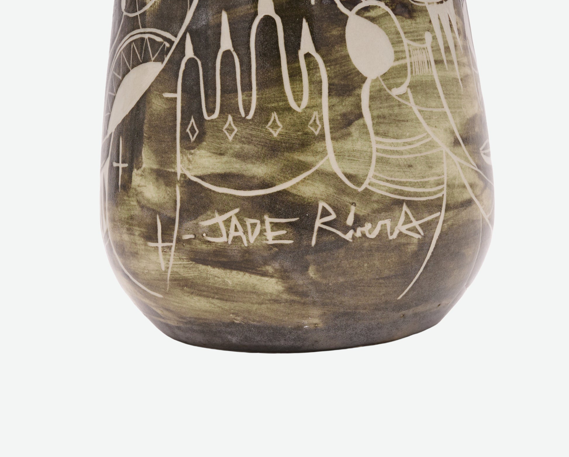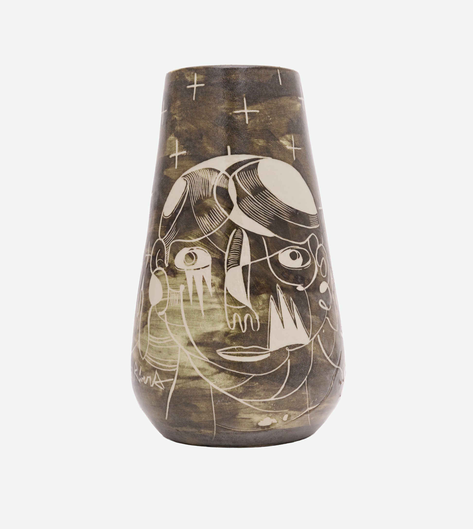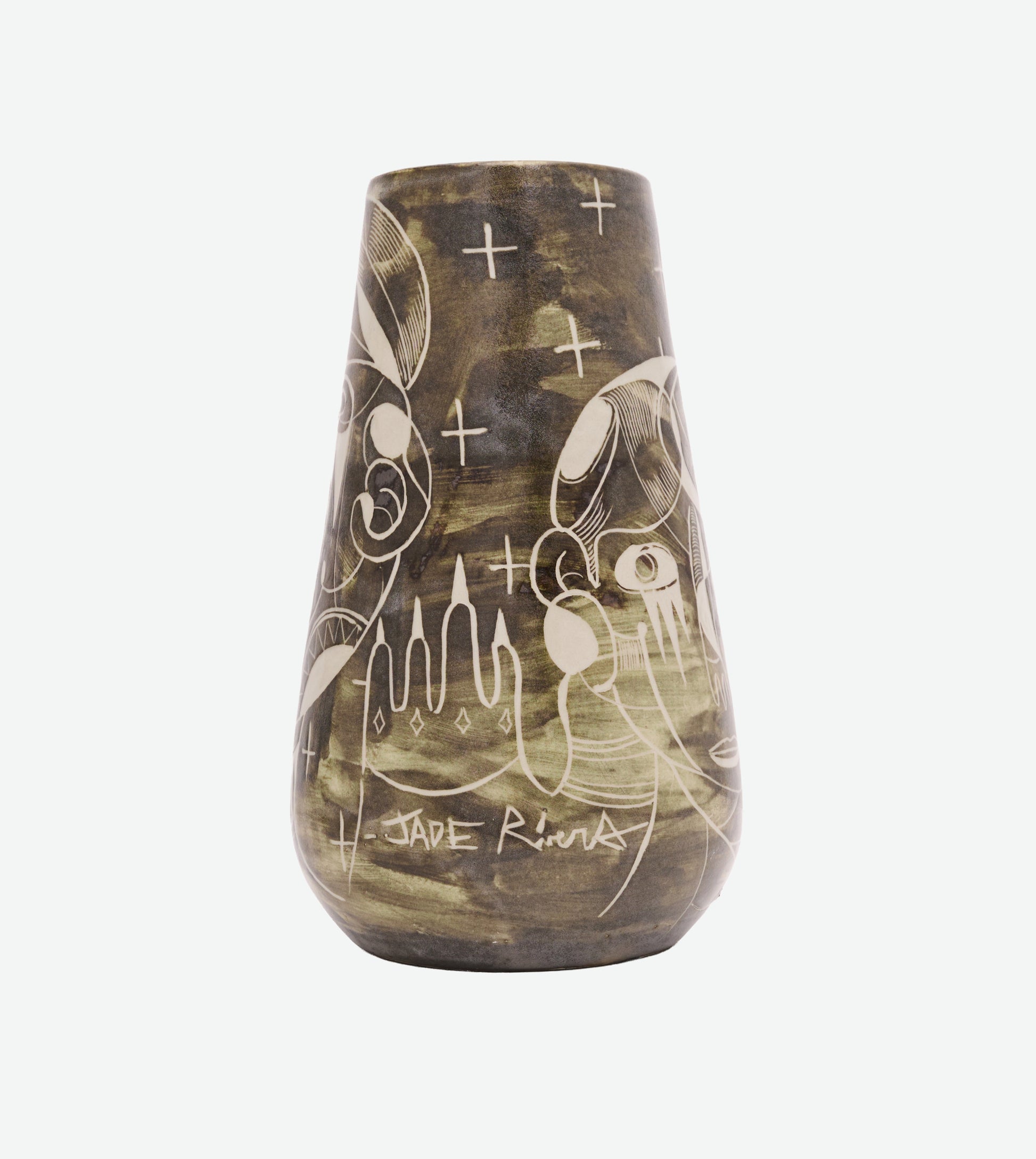 Wheel-thrown and sgraffito-carved ceramic, with iron oxide applied in the first firing and glaze no. 23 inside during the second. The exterior reveals a matte, reddish-brown surface, while the interior shines with a glossy finish — a quiet contrast between earth and light.