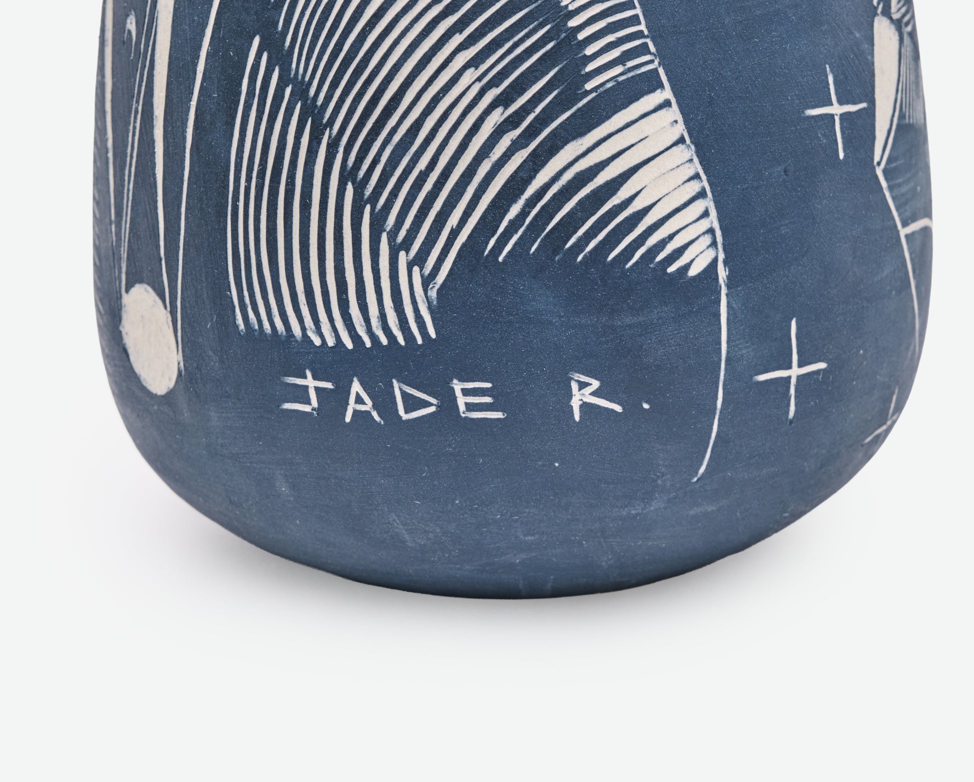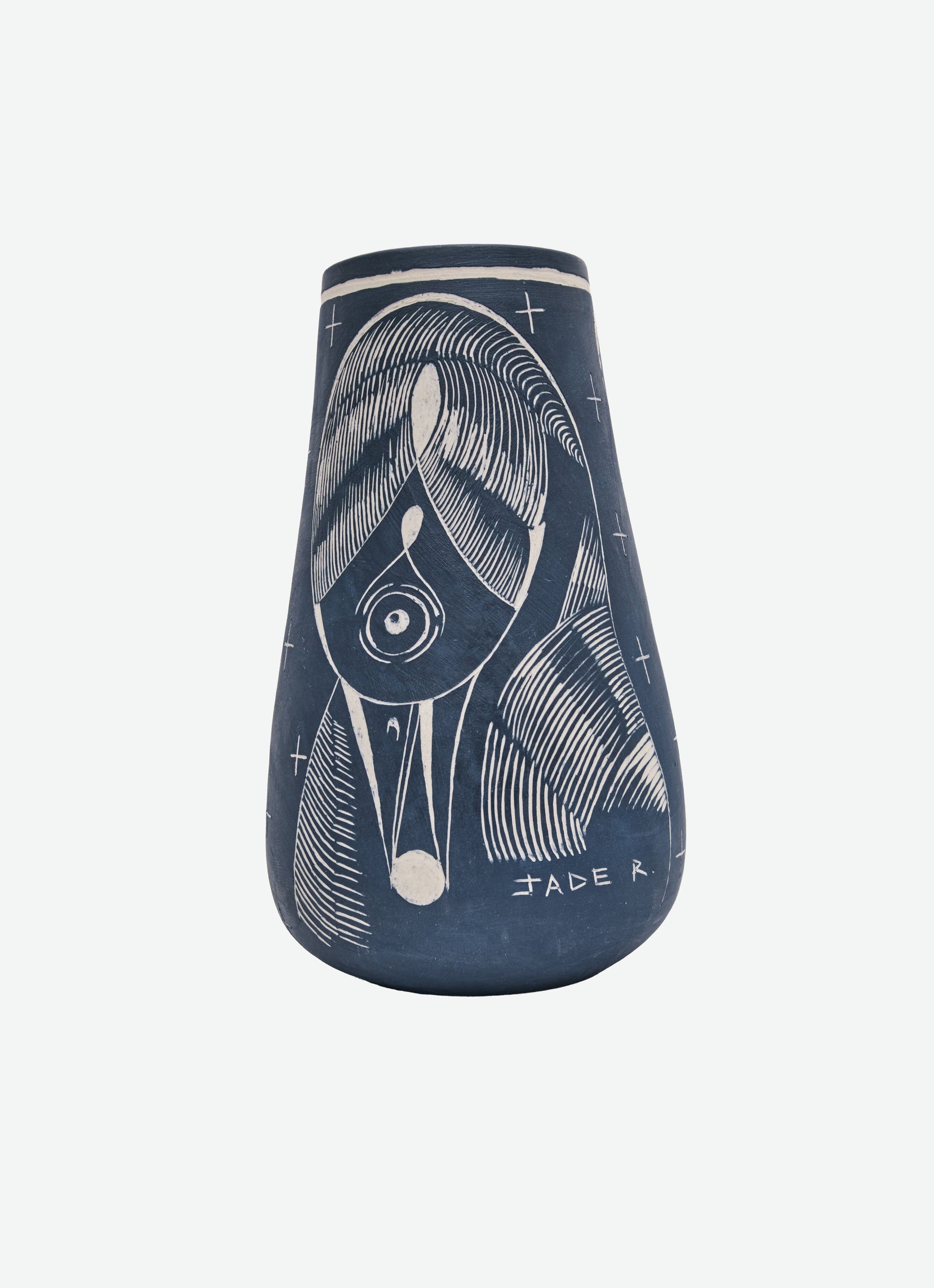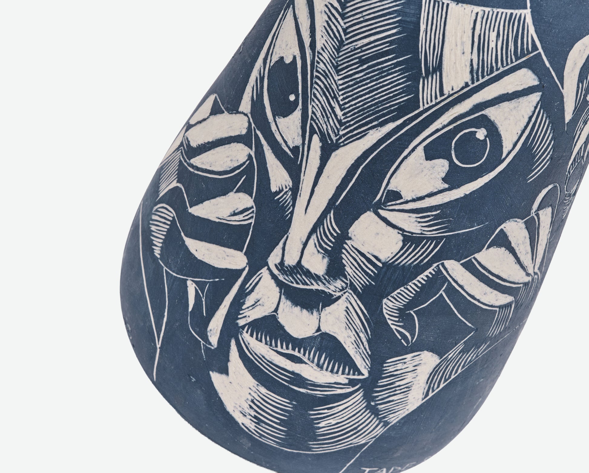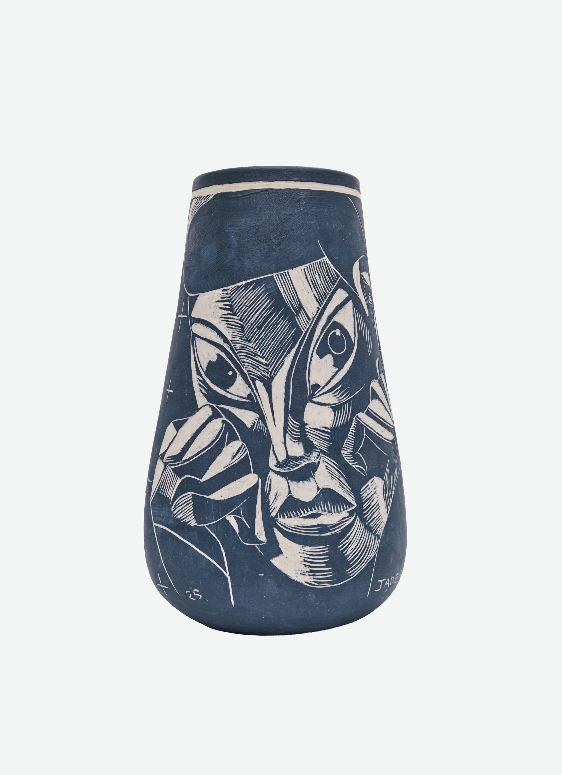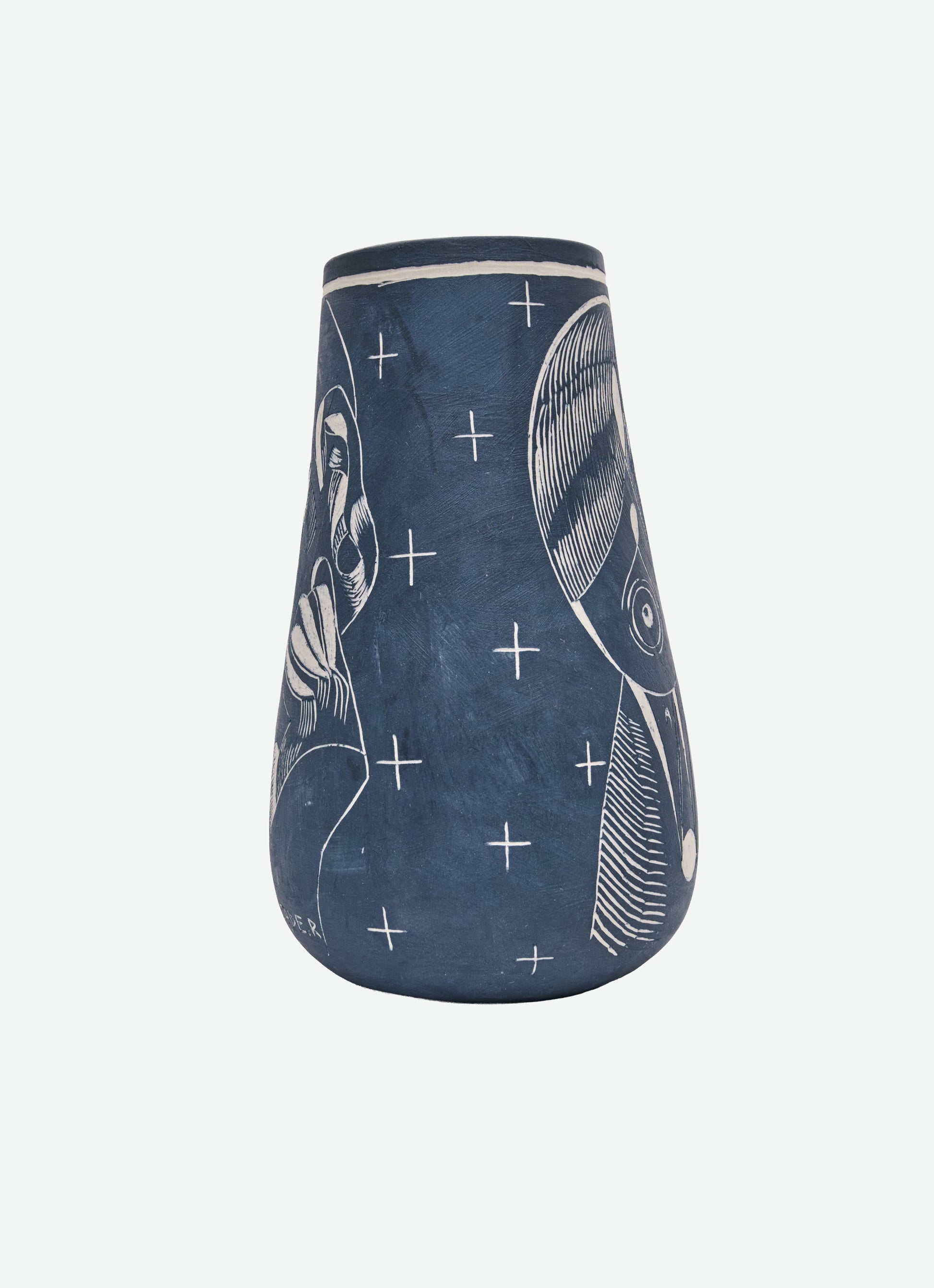 Wheel-thrown and sgraffito-carved ceramic, with iron oxide applied during the first firing and glaze no. 37 on the interior in the second. The exterior remains matte, while the inside reveals a glossy surface — a contrast of textures that enhances its deep, dark brown base and quiet, earthy presence.