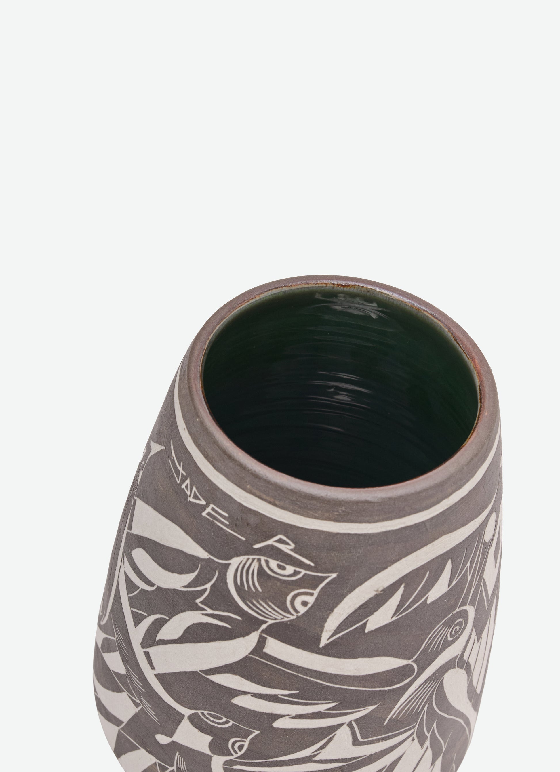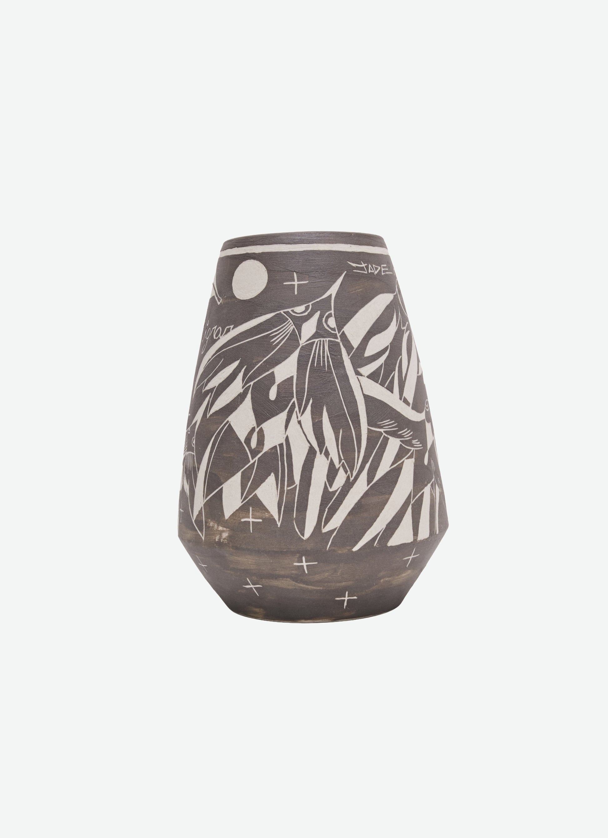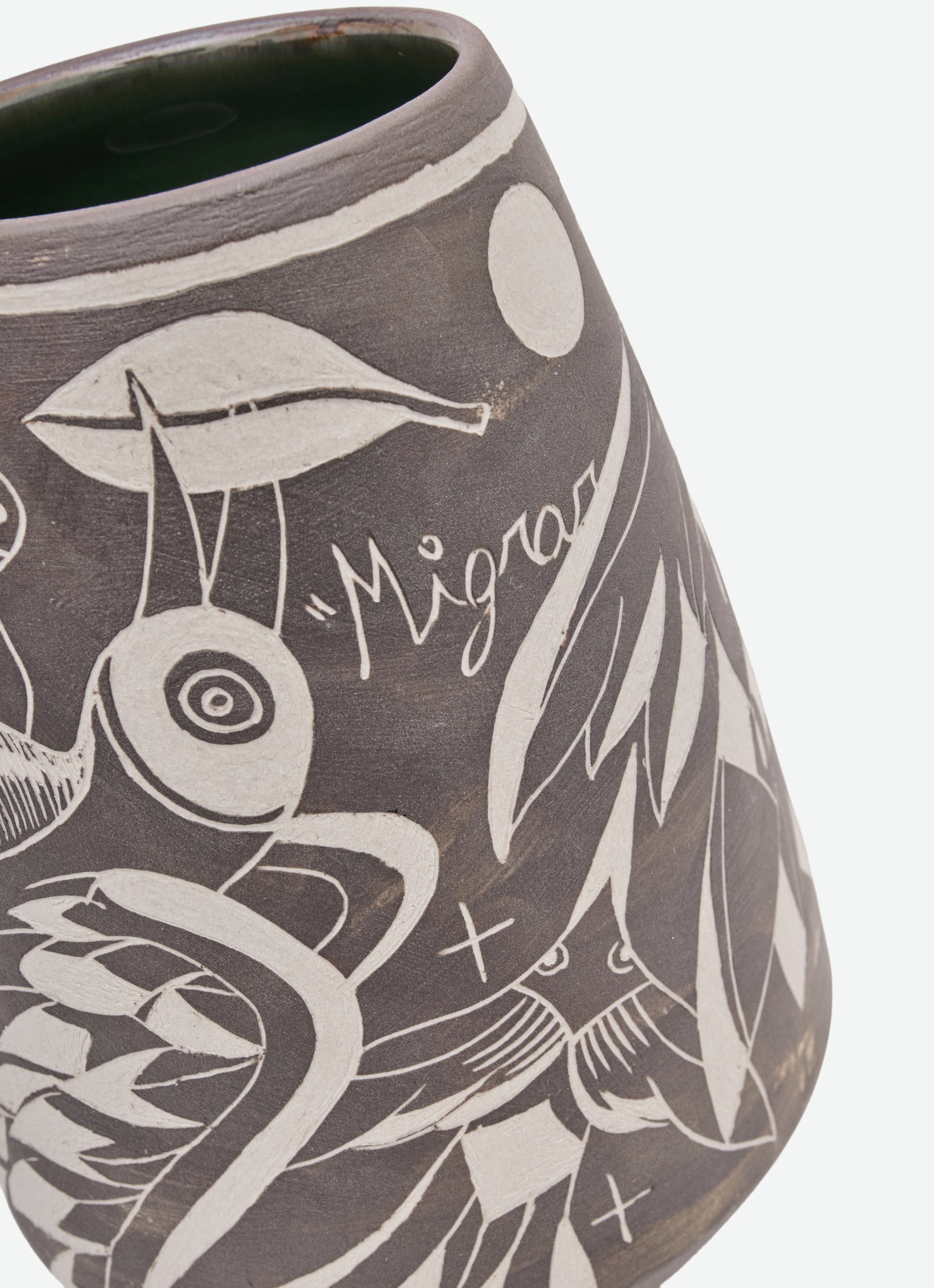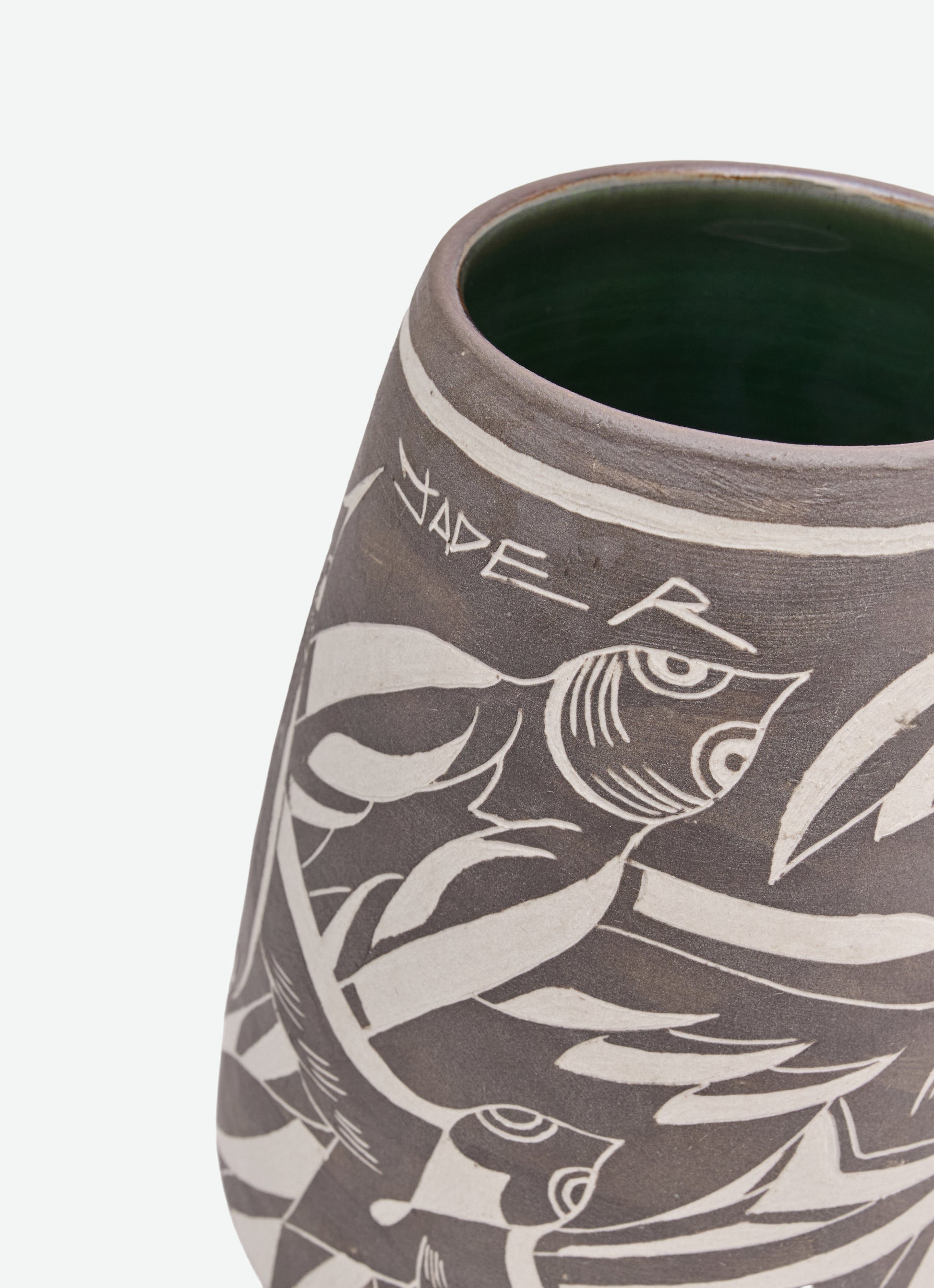 Wheel-thrown and sgraffito-carved ceramic, coated with Jewelry Blue slip during the first firing. In the second firing, a transparent glaze is applied to the exterior and glaze no. 22 to the interior. The result is a satin outer surface and a glossy inner finish, revealing a deep night-blue tone that evokes stillness and quiet luminosity.