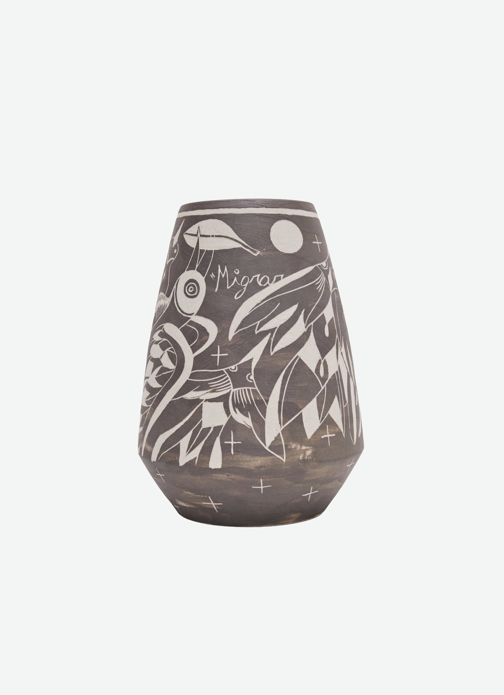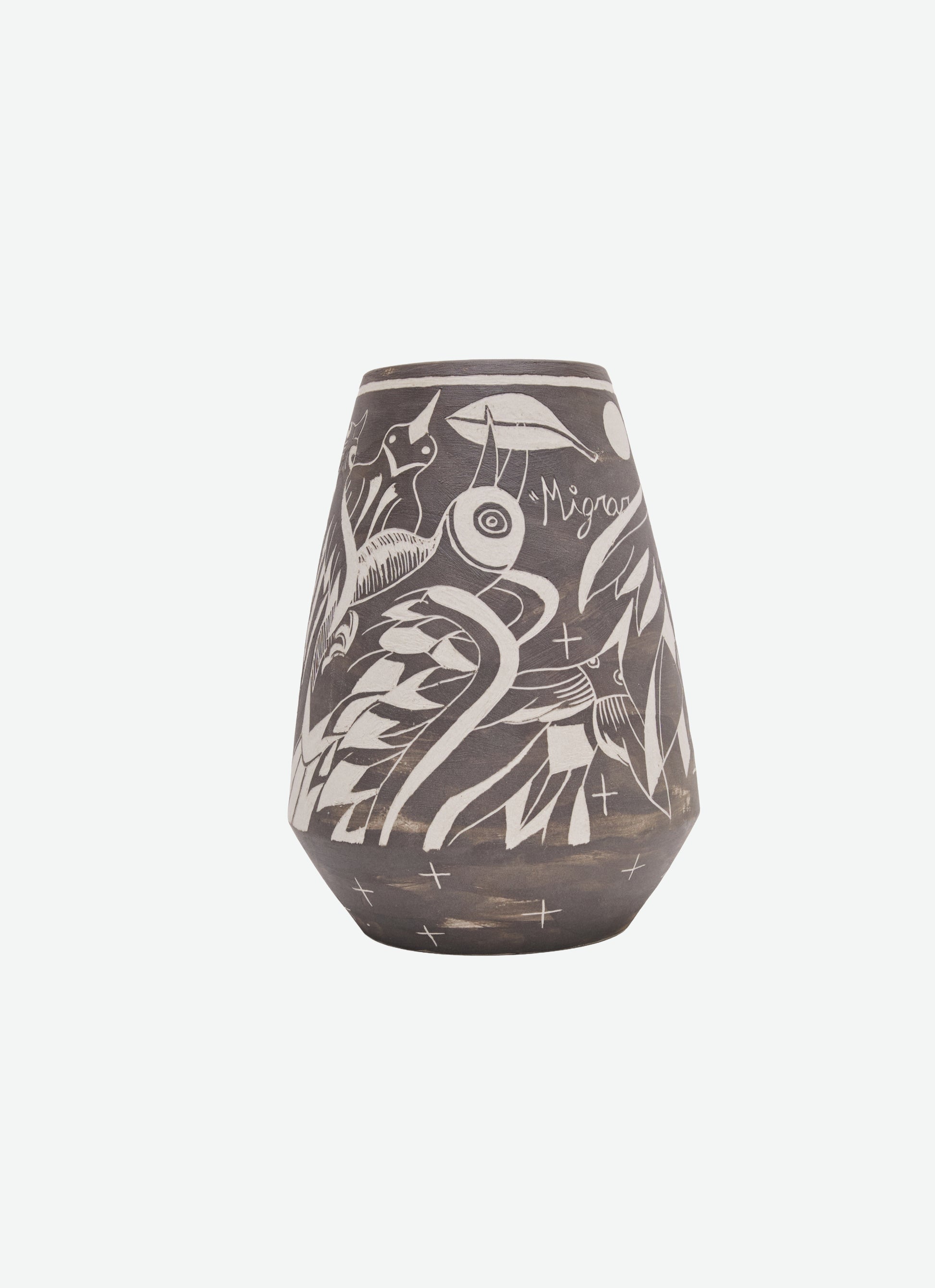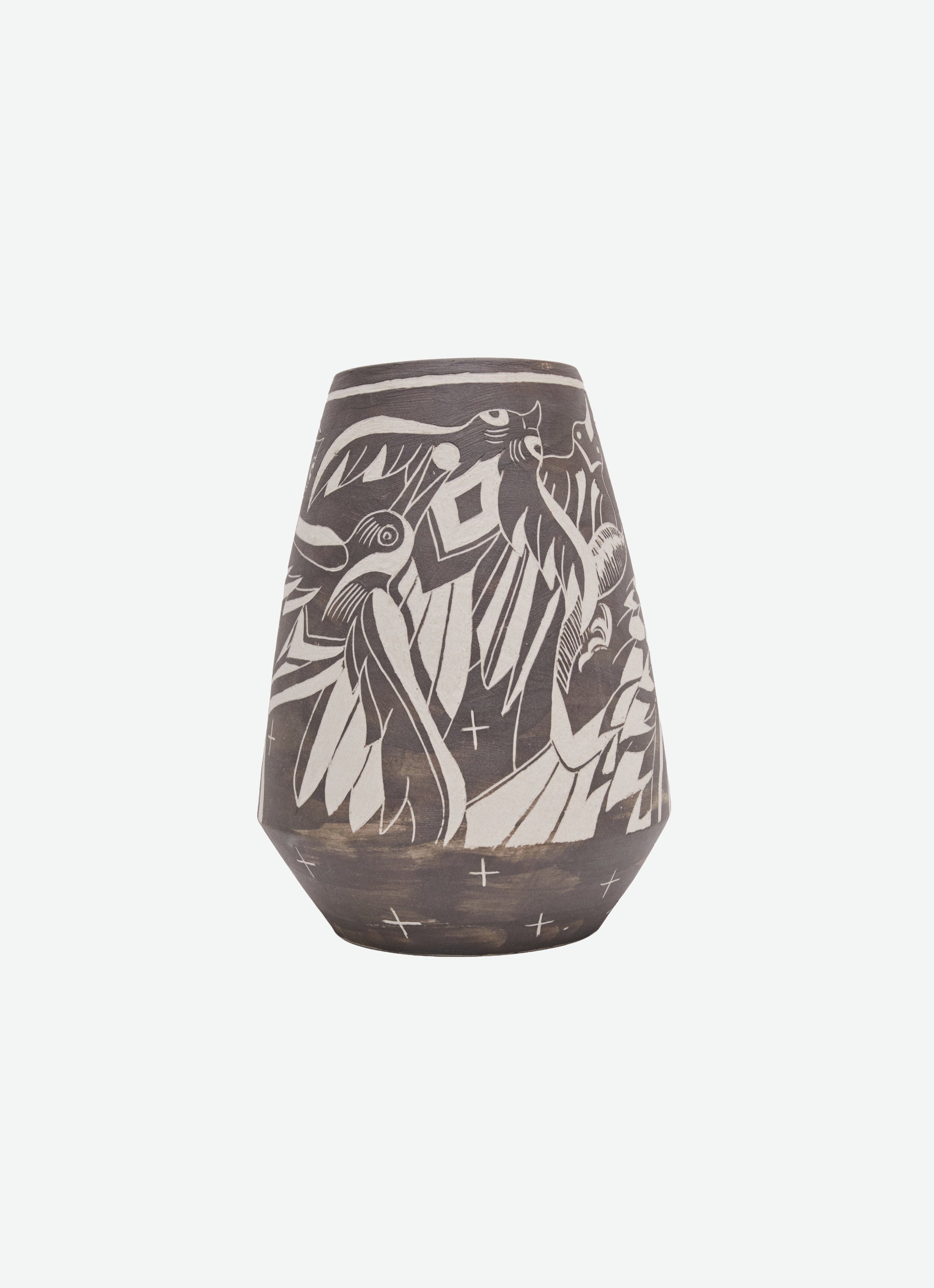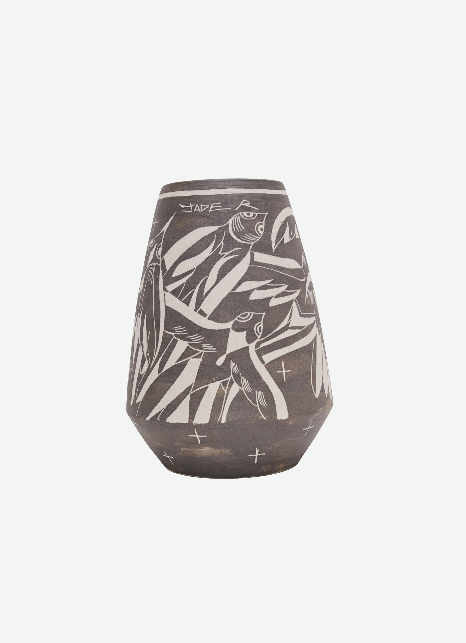 Wheel-thrown and sgraffito-carved ceramic, coated with Jewelry Blue slip during the first firing. In the second firing, a transparent glaze is applied to the exterior and glaze no. 22 to the interior. The result is a satin outer surface and a glossy inner finish, revealing a deep night-blue tone that evokes stillness and quiet luminosity.