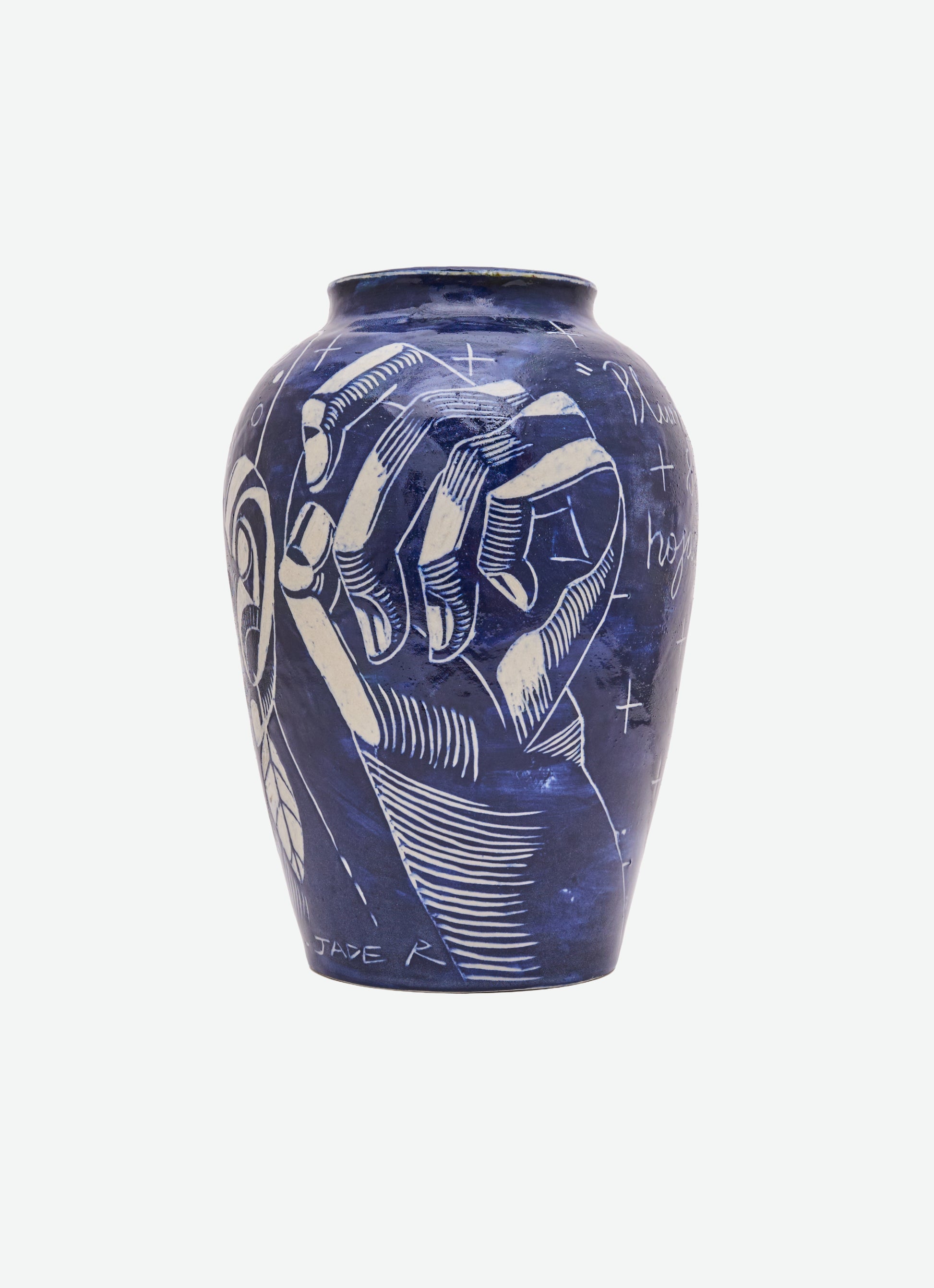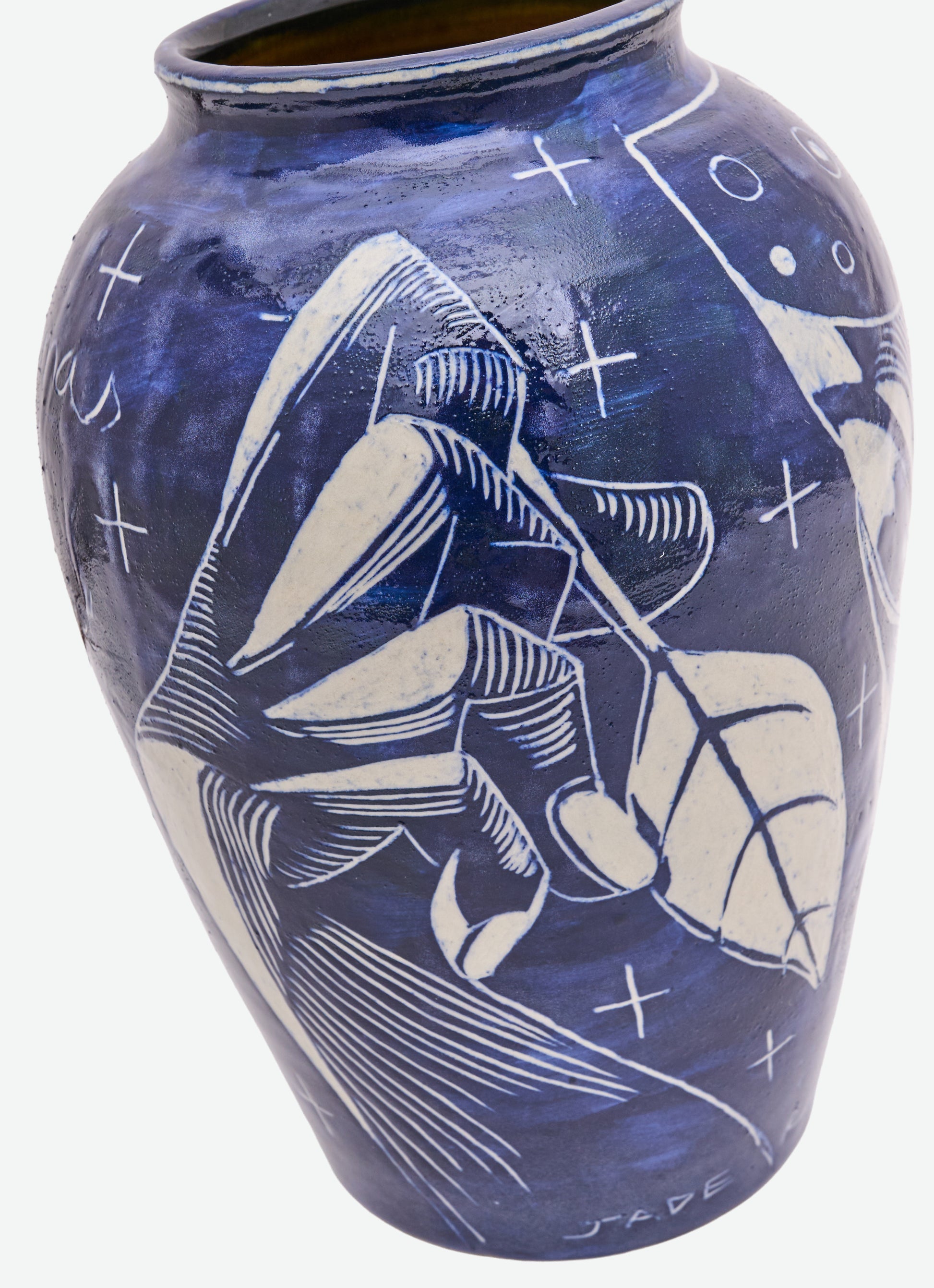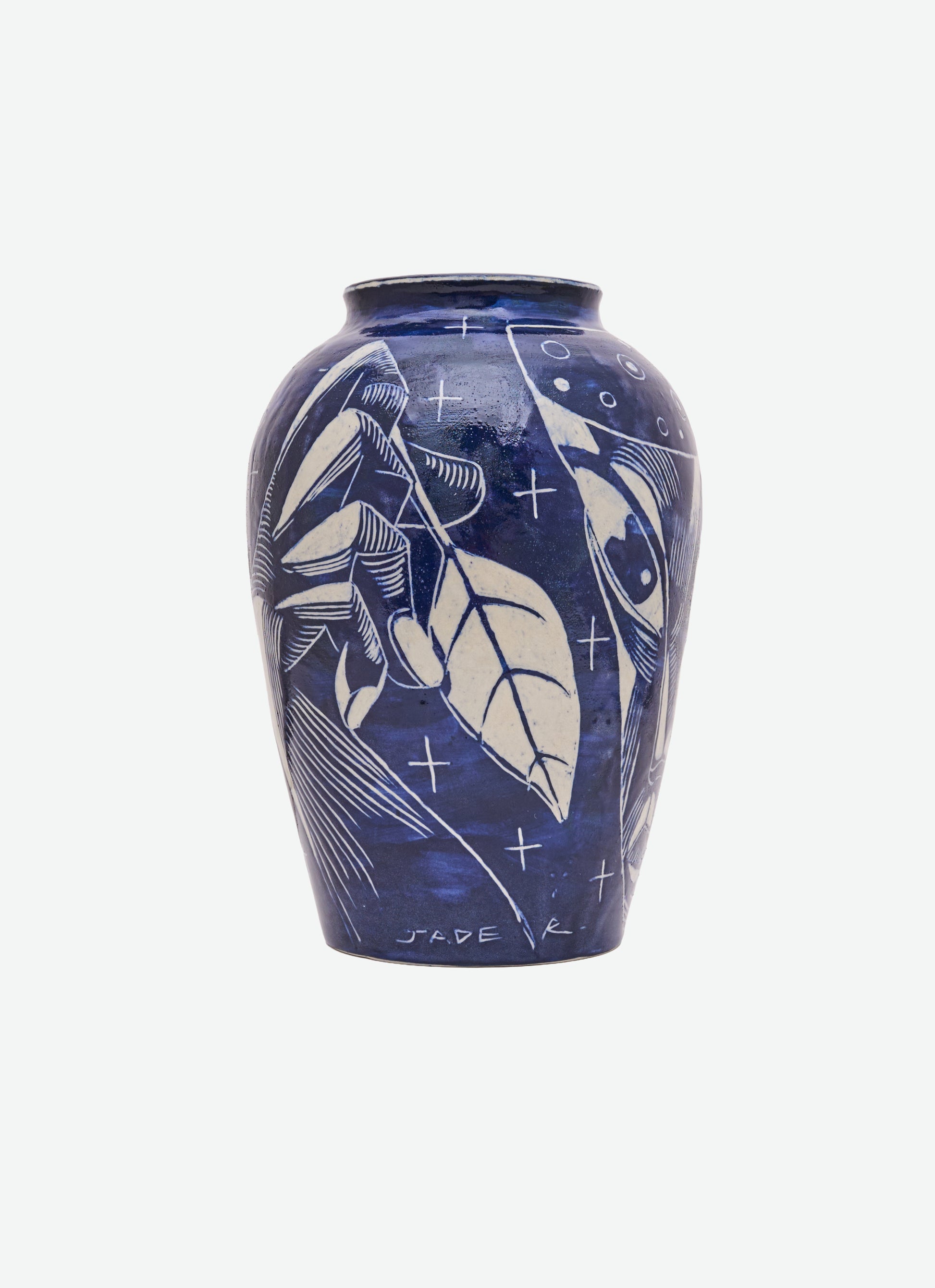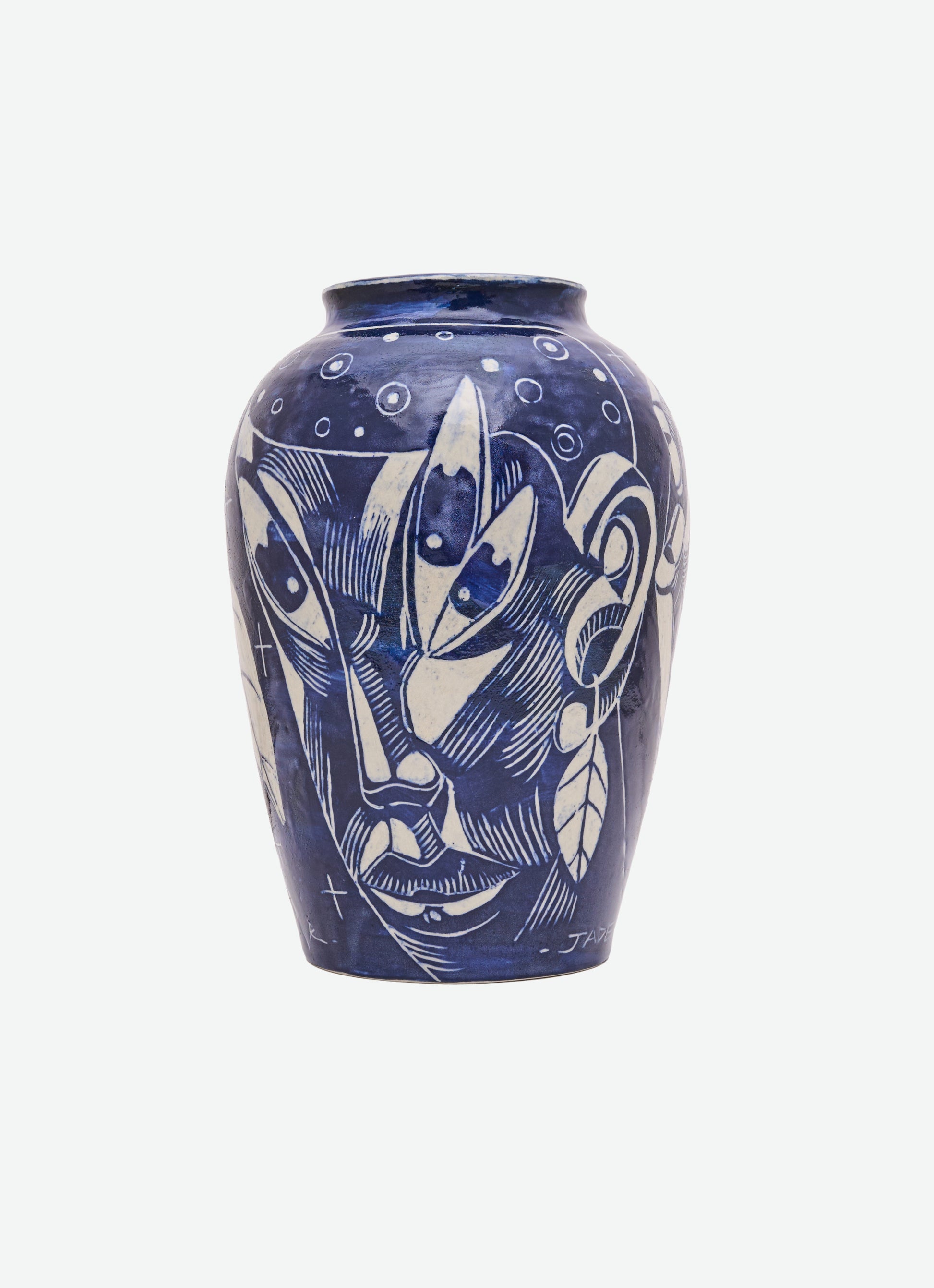 Wheel-thrown and sgraffito-carved ceramic, coated with Dark Cobble slip during the first firing. In the second firing, a transparent glaze is applied to the exterior and glaze no. 24 to the interior. The piece features a glossy finish inside and out, with a deep navy-blue tone that reflects quiet depth and fluid elegance.